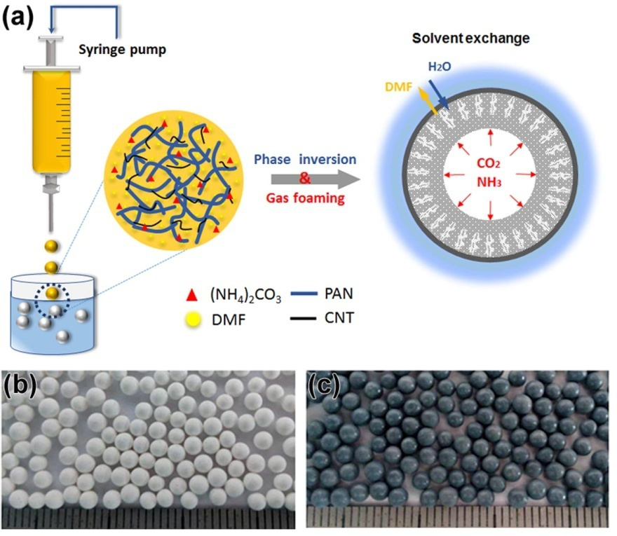 功能碳材料具有独特的物理和化学性质,在国防、能源、催化和环境等领域有广阔的应用前景。空心碳球是一种具有空腔结构的球状碳功能材料,具有质轻、导电和本征阻尼性好、化学稳定性和热稳定性高能等诸多优点。研究者采用非溶剂/溶剂界面诱导相分离法,首次制备出具有毫米尺寸的空心碳球,由于其工艺简单、可连续化生产等,便于大规模推广应用。碳壳中富含大孔扩散通道,兼具宏观毫米尺寸和极高的机械性能,能够满足固定床吸附需求。空心碳球具有优异的疏水性,能够长期稳定地漂浮在水表面,直接吸收太阳光并高效转变至热能,进而实现空气-水界面的局部加热,大幅提升表层水的蒸发速率。同时,它还具有超宽太阳光谱高光吸收效率,确保了水蒸发过程中太阳能的高效利用,有望应用于海水淡化、污水的浓缩和净化处理等领域中。