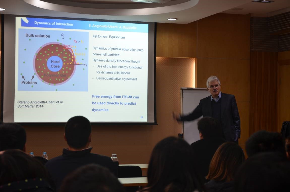 访问。Ballauff教授在实验16楼110为我院师生带来题为“Self-assembly of Proteins with Charged Polymers: Comparing experimental Data to Theory and Simulation”的学术报告(图1)。他的报告主要是关于聚电解质刷与蛋白质的相互作用,通过理论分析和计算机模拟,进一步加深了对其相互作用机理的理解。Ballauff教授丰富的知识和深入浅出的介绍,使色情片