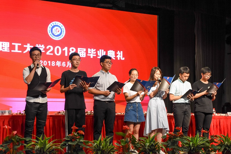 会场全体师生观摩第一会场仪式转播,并与第一会场同步向教师代表献花,宣读2018届毕业宣言《永久奋斗》。