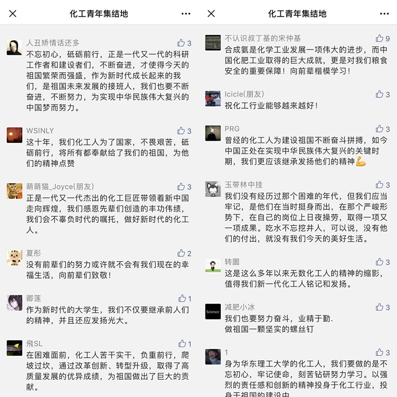 在活动前期,化工青年集结地公众号上发表的“化工巨匠”系列推送引起了同学们的热烈反响,同学们纷纷转发点赞,单篇最高阅读量达670人。“做祖国一颗坚实的螺丝钉”,“祝化工行业能够越来越好”,“向前辈们致敬”,同学们发表的留言感想,深情致敬化工前辈们创造的丰功伟绩,也表达了学习发扬化工巨匠的钻研精神,为祖国化工事业的伟大进程做贡献的决心。