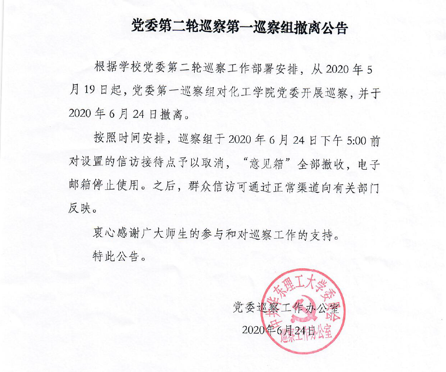 党委第二轮巡察第一巡察组撤离公告