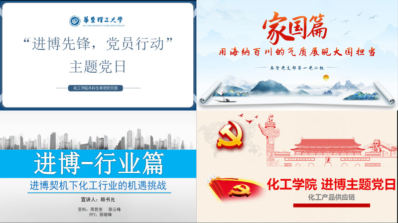 “言能践行,一诺千金”。在理论学习环节,各党小组从家国、行业、产品三个方面,共同学习了我国举办进口博览会的重大意义、重大使命和重大机遇。家国篇展示了“与世界共享中国机会”的大国担当;行业篇分享了进博契机下,化工行业面临的机遇与挑战;产品篇结合专业背景,展示了从原油到产品的整个产业链条,鼓励同学们学好专业知识,为行业进步和国家发展贡献青春力量。