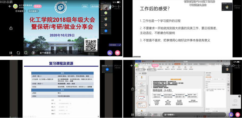2016级校友刘雨芹、2017级本科生张子钰、2020级研究生王虎成参、学院辅导员刘宗慧和周夏青与会交流。会议通过“化工青年集结地”B站平台在线直播,直播人气高达6300余人次。
