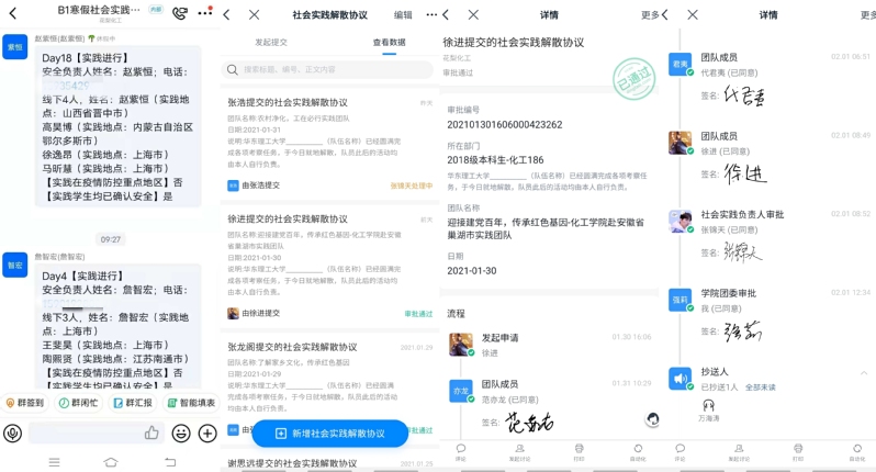 全程跟踪细管理,加强实践保障力。由于参与实践学生人数多、地域范围广,为做好疫情防控下的实践团队精准管理,加强动态跟踪及支持保障工作,学院在“花梨化工”钉钉建立13个实践专项工作组,10个实践项目编为一组,根据疫情实时变化,做好各团队实践日报及健康管理工作,实践台账清晰明确。此外,还进一步完善“线上实践解散协议”,方便多地及线上实践团队及时完成解散报备,提升了实践组织的工作效率和无纸化水平。