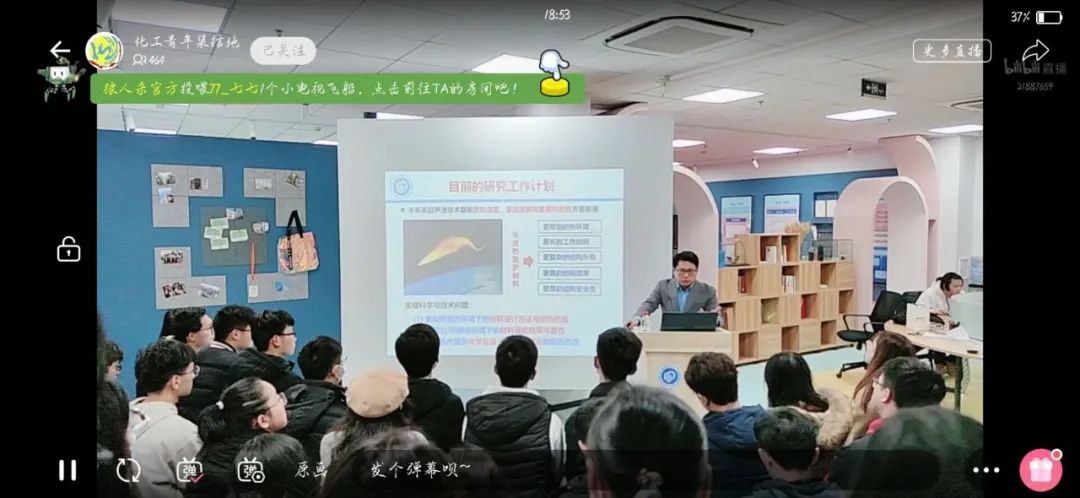 龙东辉教授为同学们带来了一场别开生面的科研盛会。龙教授从事于航天热防护材料的研究,并担任华理-航天八院热防护技术联合实验室主任、特种高分子及相关技术教育部国防重点实验室副主任,是同学们最为敬仰和喜爱的青年教师之一。小花梨新媒体工作室轻松的交流氛围、优秀青年教师的悉心传授、同学们求知的专注目光,一场令人印象深刻的研讨拉开序幕……