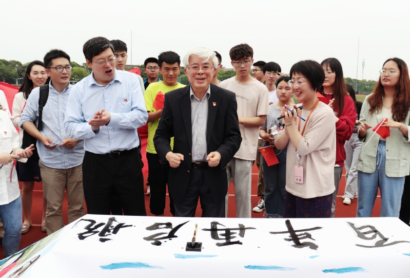 党委书记朱学栋和青年教师、学生党员为代表的老中青三代师生齐聚奉贤校区田径场,挥毫泼墨,共同谱就出一幅璀璨“红”图。参与活动的还有学院党委副书记高艺霞、段学志、吴艳阳、张相洋和各年级辅导员及百余名学生代表。