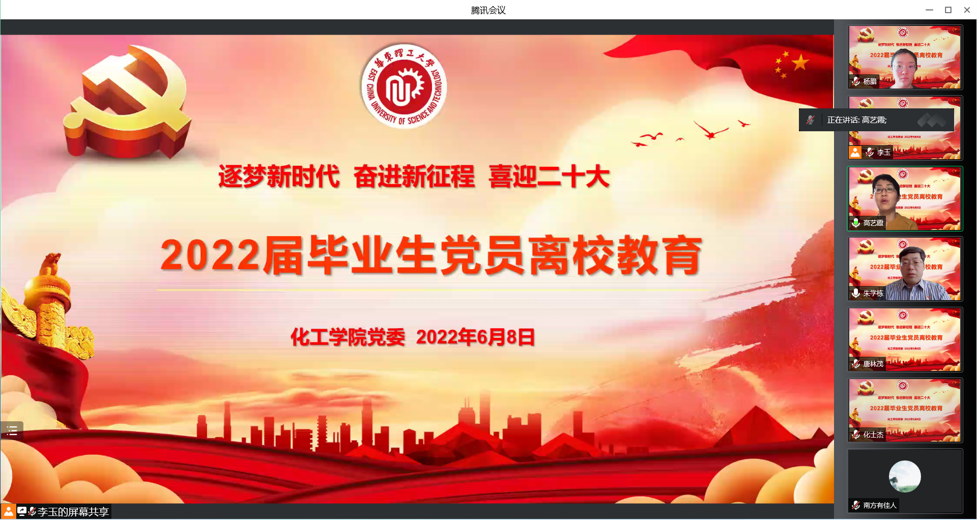 在线开展毕业生党员离校主题教育活动。学院党委书记朱学栋、副书记高艺霞、组织员李玉、辅导员杨腊和曹妙以及全体毕业生党员参加活动。活动由高艺霞主持。