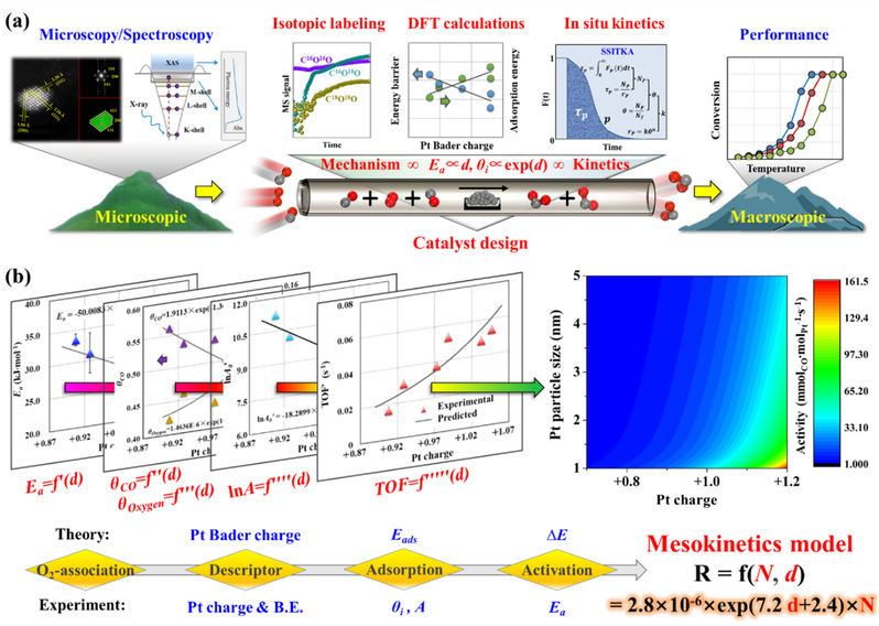 负载型金属催化剂的反应速率(r)可表达为活性位数量(Ni)与活性位活性(TOFi)之积,即r=Ni×TOFi。论文将基于催化剂几何与电子结构的数学表达式导入反应速率方程,从而获得包含金属催化剂活性位数量(N)与活性描述符(d)的介观动力学模型(图3)。该模型能准确定量催化剂微观结构对宏观催化性能的影响,是模型催化剂和真实催化剂之间的一个“桥梁”,也是架起催化剂微观结构和宏观催化性能之间的“桥梁”,促进了催化反应动力学研究向纵深发展,为基于动力学分析的催化剂理性设计提供重要理论基础。