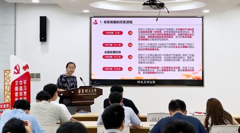 随后,联反所教工党支部的胡硕真带领大家开展了《中国共产党章程(修正案)》专题学习。她带领大家一起回顾了从党的一大《中国共产党纲领》到党的二十大《中国共产党章程》的发展史,并对比了党的十九大《中国共产党章程》,详细阐述了党的二十大《中国共产党章程》在总纲、党员和党的干部、党的基层组织和党组、党的纪律和纪律检查机关等方面的变化细节以及变化的原因与内涵。