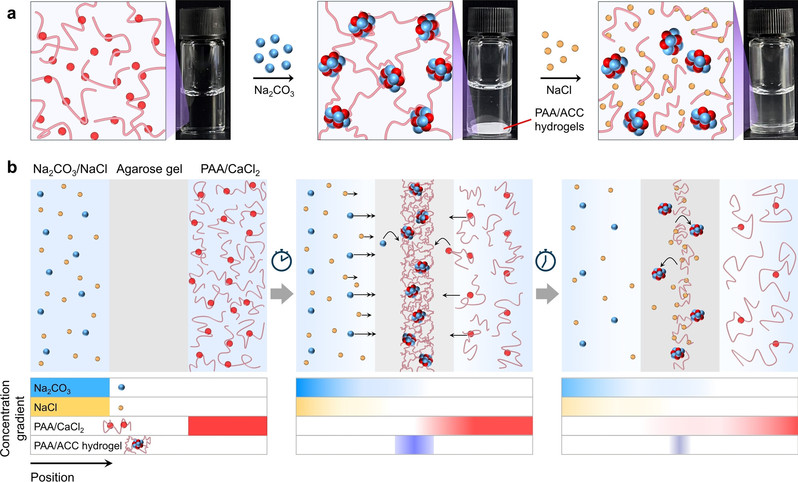 郭旭虹教授团队提出了一种通过反应扩散控制动态超分子自组装的新策略,基于一类聚丙烯酸/无定型碳酸钙(PAA/ACC)超分子凝胶系统,成功实现了结构化超分子水凝胶的动态生长。该工作以“Dynamic growth of macroscopically structured supramolecular hydrogels through orchestrated reaction-diffusion”为题发表在Angew. Chem. Int. Ed.(Angew. Chem. Int. Ed. 2023, e202310162)上。