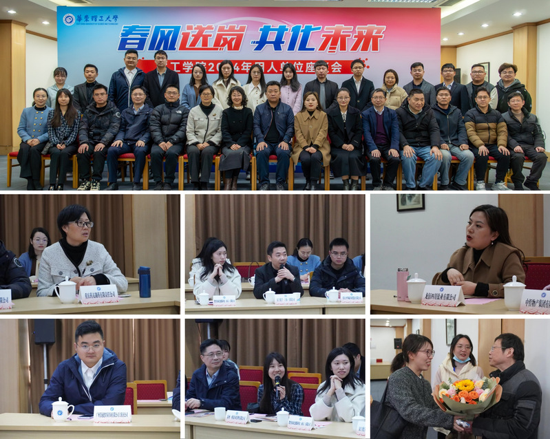 招聘会前,学院召开了用人单位座谈会,高艺霞、徐至、相关系所主任与企业代表深入交流。企业代表对学院人才培养质量给予了充分肯定,并结合单位用人情况、围绕高质量人才培养畅所欲言、献计献策,对华理优秀学子求贤若渴。座谈会后还出现了不期而遇的温馨场面,作为企业代表的两位校友专程为自己在校时的老师送上了鲜花,表达了对母校老师最真挚的祝福。