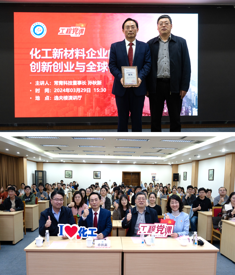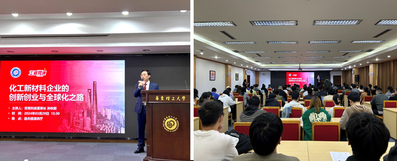 孙秋新先生结合企业发展为在座师生详细解读“新质生产力”的内涵,创业过程中战略布局思路,技术研发守正创新之路以及产业全球化面对的机遇与挑战等。孙秋新还结合具体产品开发案例,告诉大家企业是如何在化工新材料领域落实创新理念,促进科技与产业融合与高分子材料的生活化运用,推动我国化工产业的高质量发展。讲座过程中尽显企业家的责任与担当。最后,孙秋新先生结合当代大学生实际情况,用生动质朴的语言阐述了青年党员贵在勤奋、重在立志,唯有认清自我方能以青春奋斗奉献祖国。这也恰与色情片