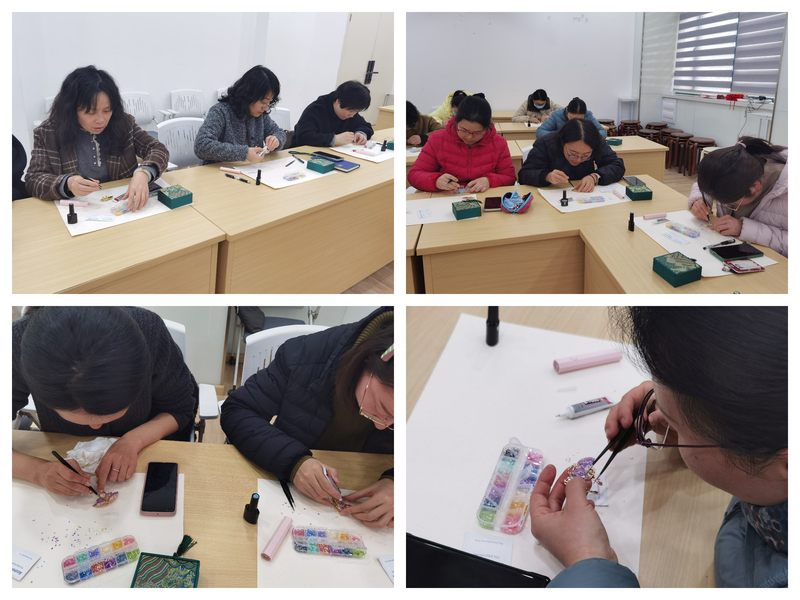 活动正式开始后,非遗匠人李小芳老师为大家讲解了螺钿工艺的历史与文化背景,并现场示范了制作流程和技巧。女教职工们专注创作,根据个人喜好组合珠片、贝壳等材料,打造出独具个性的螺钿胸针。大家在互动中不仅体验了传统手工艺的魅力,也增进了彼此之间的交流与合作。