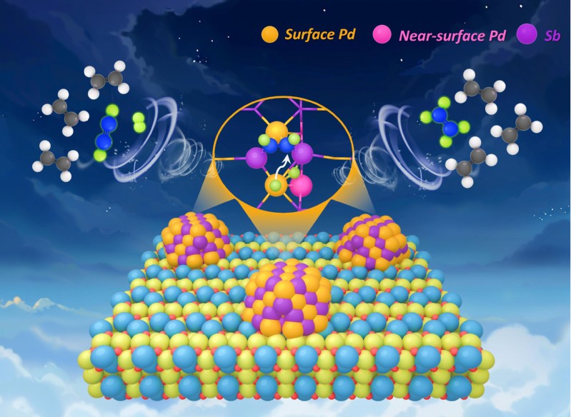 催化反应工程团队段学志教授、曹约强特聘研究员基于吸附构型匹配策略在炔烃加氢催化剂创制方面取得新进展,构建兼具表面Pd1Sb2三原子位点与近表面Pd位点(Pdns)的PdSb金属间化合物催化剂,实现烃类吸附与氢气活化位点的空间解耦,突破了加氢反应活性与选择性平衡制约。相关研究成果以“Synergizing Pd1Sb2 Site with Neighbouring Near-Surface Pd Site to Break Trade-Off between Selectivity and Activity of Alkyne Semihydrogenation”为题在线发表于《美国化学会志》。